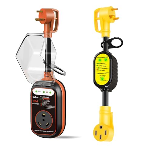 RV Certified RV Surge Protector 30 Amp - The EyGde upgraded 4500 Joules 30 amp rv surge protectors with Certified, very safety and reliable. It can identify the faulty power sources quickly. Protects your RV trailer electrical equipment from dangerous high or low voltage, even sudden power surges caused by thunderstorms or lightning strikes. Great camper accessories gifts for RV, travel trailers, motorhome. Gives your peace of mind!