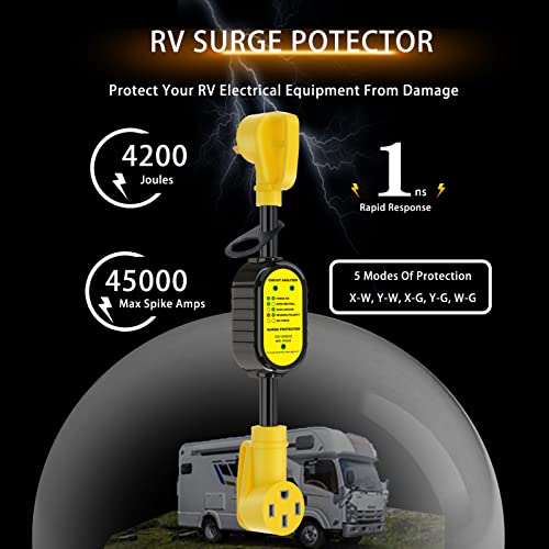 ?30 AMP TO 50 AMP SURGE PROTECTOR FOR RV?Identifies faulty park power plus offers 4200 Joules of surge protector. 30 to 50 amp rv adapter for camper protects your RV electrical equipment from dangerous high/low voltage, electrical disturbances, and sudden power surges due to thunderstorms. It can work many times to block surge until a super strong surge beat it!