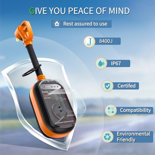 IP67 Waterproof RV 30A Surge Protector - This rv surge protector made of high quality fireproof shell material and is designed for indoor outdoor camping use. With clear waterproof cover is all weather resistant and can be used in all seasons. It can protects the rv circuit from rain, wind, storm or other bad weather. Effectively reduce the risk of short circuit or fire