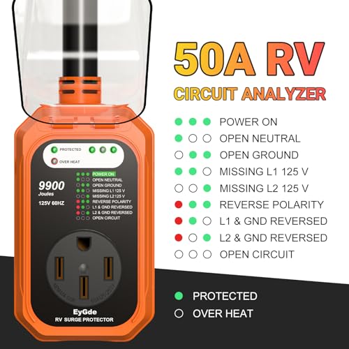 ?UPGRADED WATERPROOF COVER?This RV 50 amp surge protector has been upgraded with a larger waterproof cover, suitable for larger size power plugs, protecting the circuit from rain, wind, and sandstorms. Weatherproof Clear Lid - Ideal for outdoor use with easy-to-read LED indicators when the lid is closed