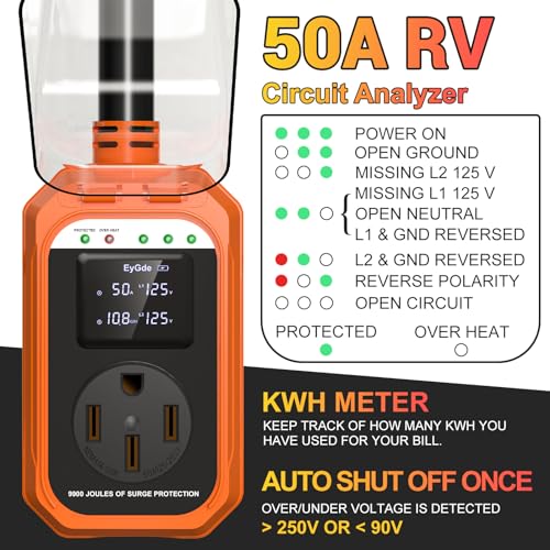 All In One Smart 50 Amp Surge Protector for RV - Designed with large LED display which has readout of real-time Amps, Watts, KWH and voltage. Equipped with indicated lights and larger waterproof cover, provides reliable insurance for your rv electrical system. Notes: Without Bluetooth or WiFi