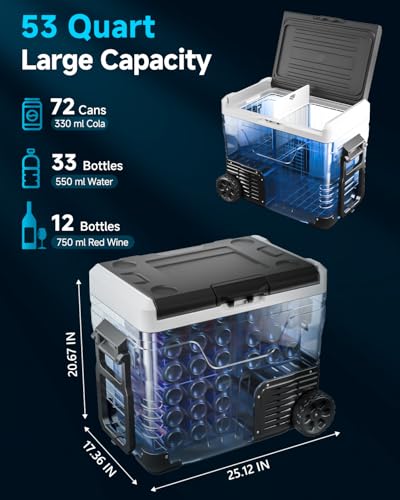 ?Large Capacity & Flexible Storage Space? - Experience unparalleled storage with our 50L (53 Quart) car refrigerator, perfect for a variety of needs—store up to 72 cans, 33 bottles, or 12 wine bottles with ease. The versatile compartment design (fridge or freezer) , with two storage baskets and a partition, keeps your items organized and fresh, ready for camping, travel, gatherings, picnics, barbecues, and house parties.