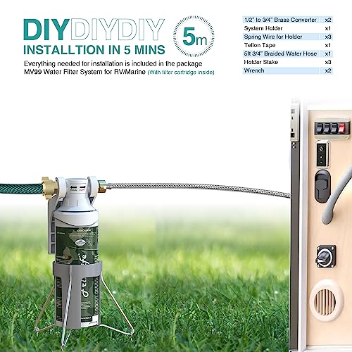 [Auto Shut Off Design] A filter holder with metal pegs is included in the filter package which is perfectly designed for outdoor usage. It helps keep the water filter upright while in use, reducing hose kinking and maximizing the filtration performance. The RV water filtration system can also be mounted on the wall by using provided screws. The water filter is featured with AUTO SHUTOFF design. Namely, you don’t even need to shut off the water supply when you are about to change the filters.