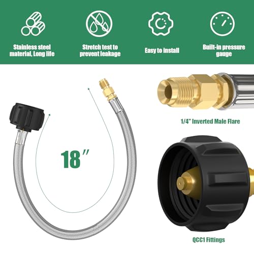 ??High-Quality Material?1/4 inch inverted male flare , Gauge, 3/8" Male Flare Fitting Connector are Made of 100% Solid Brass. 24 inch QCC1 1/4" Inverted Male Flare RV pigtail Propane Hose is Made of Durable Stainless Steel Braided with Weather Resistance, Anti-corrosion, Anti-aging, Air Tightness, Heat-resistance, Flexibility Features. Durable Solid Brass Provides Secured Connections Between Appliance and Tank. This Propane Hose with CSA Certification, Ensures Air Tightness and Stability.
