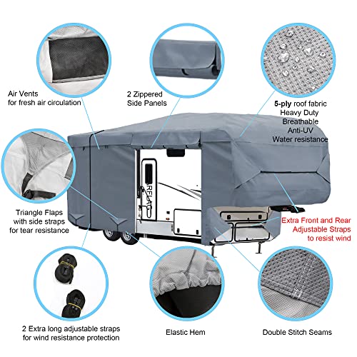 [ WINDPROOF, SNOW STORM PROOF ]: The camper cover comes with multiple straps on each side to hold the cover in place against strong wind. 2 pieces of long straps are provided to wrap around the whole camper for windproof upgrade. Protects resale value of travel trailer. For better protection from wind, please wrap around the camper cover with the 2 pieces of extra long wind proof straps.