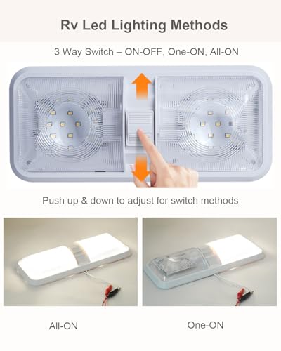 Convenient 3-Way Switch: rv ceiling lights led 12v enable you to use one side or both sides of the light independently by sliding the switch up or down to meet your different lighting needs. 3 Way Switch – ON-OFF, One-ON, All-ON.