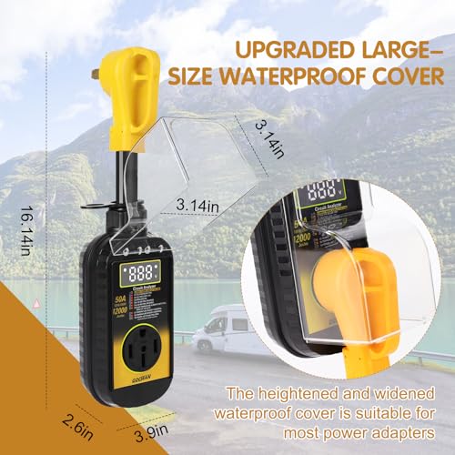 UPGRADED WATERPROOF COVER - This rv 50 amp surge protector has been upgraded with a larger waterproof cover, suitable for larger size power plugs, protecting the circuit from rain, wind, sandstorms. All weather resistant can reduce the risk of short circuit.