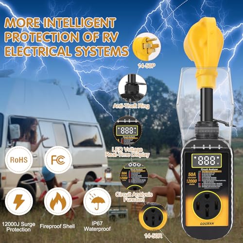 LCD Display 50 Amp Surge Protector for RV - This Gociean upgraded 12000 joules rv surge protector can display real-time voltage value, whcih is a must have for 50 amp rv camper. With an 12000 joule protection rating, this surge protector provides comprehensive protection for your camper's sensitive electronics, appliances, and electrical systems.