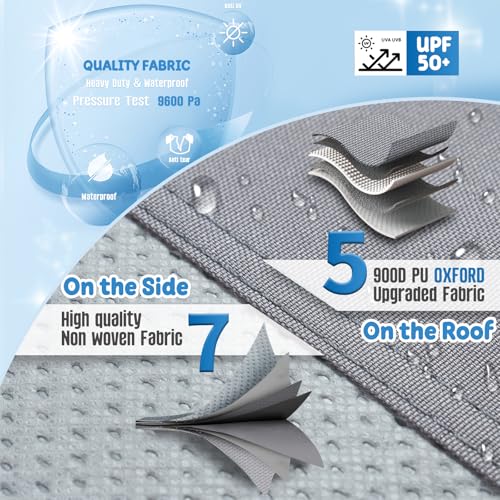 ?Reliable Protection & Longer Use?Thicker 7 layers of non-woven fabric on the sides, 900D PU Oxford on the roof and tension panels of rv cover. The webbing seam is covered with waterproof strip to prevent water seepage at the top. All stitching is a double seam design, and high-density bound seams for great durability to decrease water entering from the stitching. Our camper cover shields your RV from rain, snow, strong winds, bird droppings, dust, and scratches, prolonging the life of your RV.