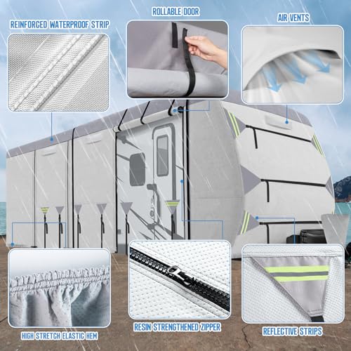 ?Ventilation & Accessibility?8 x air vents reduces wind stress and vent moisture inside, breathable material allows for maximum water evaporation under the cover. 3 x rollable zippered door allow access to the RV doors and engine areas anytime, easy to view and check internal situation. 12 x reflective strips ensure maximum safety during night or snowy conditions and while parking. We provide 6 gutter covers with sponges to prevent any scratches during installation.