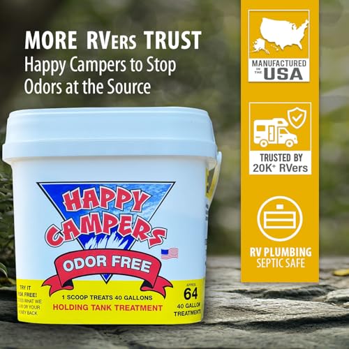 Easy to Use: Simply add the measured amount of Happy Campers to your RV holding tank, and let our formula do the rest. One scoop (2 tablespoons) treats up to 40 gallons. No mess, no fuss – just straightforward application for a worry-free adventure.