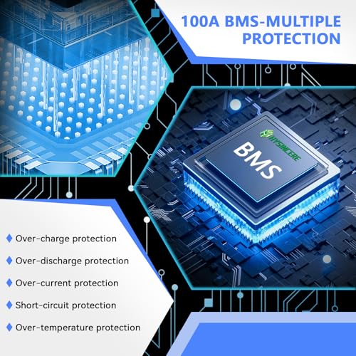 ?High Performance with A Grade Cells&100A BMS? HYSINCERE 12V 100Ah LiFePO4 Battery features four A-Grade Lithium Cells and a Robust 100A Battery Management System (BMS) that offers comprehensive protection against Over-Charging, Over-Discharging, Overvoltage, Overcurrent, Short Circuits, and Overloads, Ensuring reliable power delivery for various applications.