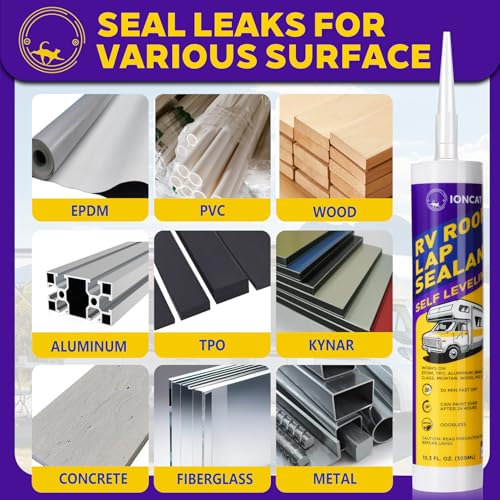 Widely Applicable RV Roof Sealant: The self leveling sealant is not only good for RV roof, but also works great for campers, travel trailers, off-road vehicles etc. Every large cracks in your RV is good to patch. The RV caulk is suitable for surfaces like EPDM, TPO, PVC, aluminum, brass, steel, glass, mortar, wood, etc.