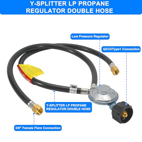 ?2 hose y-splitter propane regulator?: Dual hose gas grill regulator, connect to two low-pressure propane appliances, only need a propane tank, convenient and efficient.