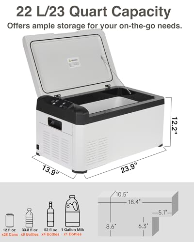 LARGE SPACE: Pack everything you need for your adventures! With a 23 quart, this car fridge can hold up to 28 cans (12 fl oz). Perfect for family road trips, van life, or cross-country RV adventures, it’s like a portable freezer that keeps food happy, no matter where you go.