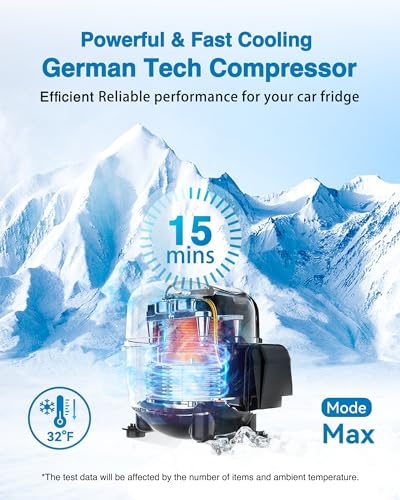 QUICK COOLING IN 15 MINS: Industry-leading compressor tech providing powerful cooling with a temperature range of -7°F to 50°F. It can reduce the temperature to 32°F in 15 minutes. Car cooler features an aluminum interior, which is durable and has a thicker insulation layer, which improves the insulation effect by more than 15%, Keep drinks ice-cold even on desert road trips.