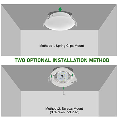 ?Easy installation? Recessed mount with 2 springs provide more safe and easy installation.it also can used 3 screws to hold it in place directly. includes 2 lead wires for Power, comes with nuts.mounting screws will be hidden by the lens.no electrical tapes required. suitable for ceiling recessed mounting.