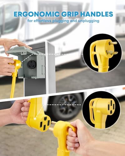 ?Grip Handle Design?Both ends of the 30 Amp to 50 Amp RV power adapter are designed with ergonomic Grip handles, making removal from a plug or outlet much easier, effectively saving physical strength.