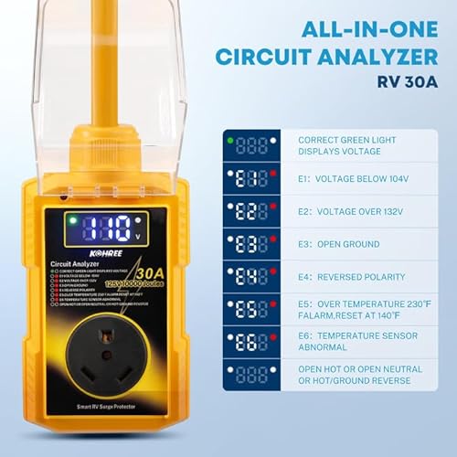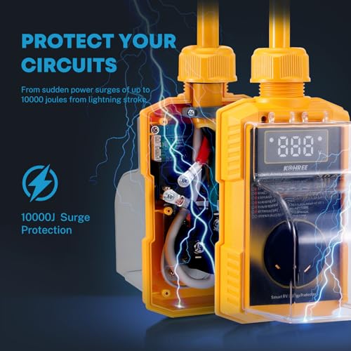 ?10000 Joules Surge Protection?Kohree 30 amp RV surge protector absorbs high voltage spikes within 1 ns, protecting your RV/camper and electrical systems from electrical disturbances and sudden power surges caused by thunderstorms.