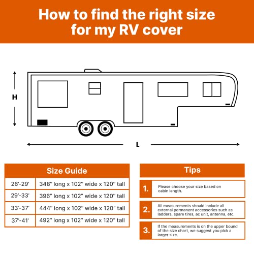 ?UPDATED DURABLE MATERIAL?The Fifth Wheel RV trailer cover has a reinforced polyester fabric with double stitching. Premium top fabric and multi-layers of side fabric are tearing-resistant materials protecting your RV from UV damage, dirt, and debris, avoiding environmental hazards with its help to keep its appearance and extend the life of your camper. There is extra thick fabric in high wear areas and reinforcement panels on the straps prevent tearing in high wear areas.
