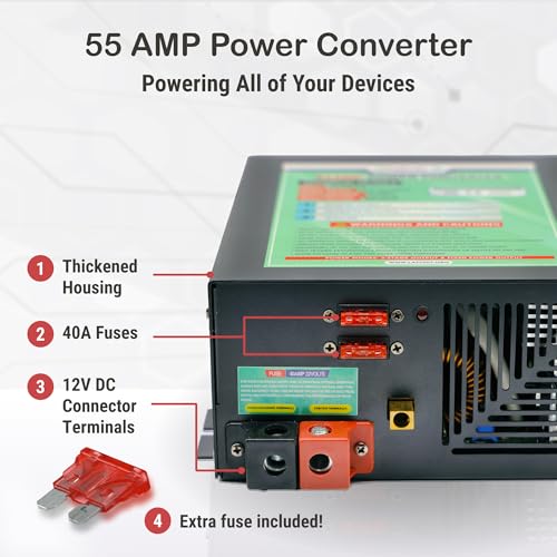 RELIABLY CONVERT 120V AC SHORE POWER to CLEAN 12V DC POWER. Our 55 AMP RV CONVERTER will power a wide range of electronics including car chargers, LED lights, small fans, car audio systems and MUCH MORE. COMPATIBLE WITH BOTH LEAD ACID, LITHIUM ION BATTERIES AND MORE. Our camper power converter can be used in various applications such as cars, RVs, trailers, and campers.