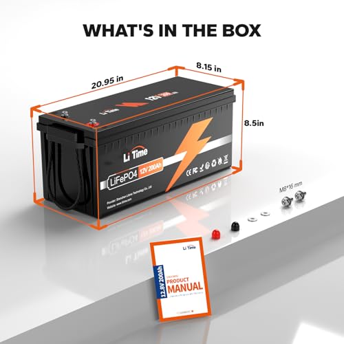 Automotive Grade A Cells LiFePO4 Battery: LiTime 12V 200Ah classic Lithium Iron Phosphate (LiFePO4) batteries are made of A-grade cells for higher energy density, more stable performance, more power, and a self-discharge rate of only 3%. The cells inside the battery are UL tested and FCC, CE certified and IP65 waterproof, which set you free from worrying to install indoors or outdoors.