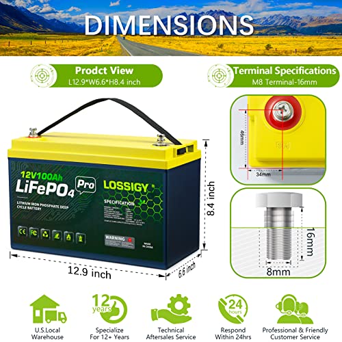 What You Get: LOSSIGY 12V100Ah Lifepo4 battery, Positive and negative wiring, 4 Extra Removable M8 Battery terminals screws, Product parameter guide.