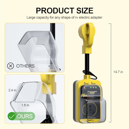 Exceptional Product Design: Our 50 Amp to 30 Amp rv surge protector comes with a reliable waterproof cover for all-weather use. This robust cover shields against rain, wind, and harsh weather conditions, effectively reducing short-circuit risks. Its contoured grip design makes plugging and unplugging effortless, ensuring a hassle-free plug-and-play experience.