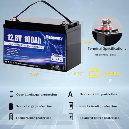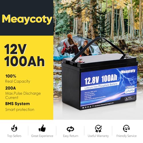 100% BMS Protection: Meaycoty 12V 100Ah lifepo4 battery has a built-in 150A BMS, the continuous charge and discharge current is upgraded to 100A, the peak discharge current is 200A for 5 seconds, and supports a maximum load power of 1000W. The BMS system provides overcharge, over discharge, over current, short circuit, low temperature and high temperature protection. If the battery status is abnormal, the BMS will immediately cut off the power supply to ensure that no accidents will occur.