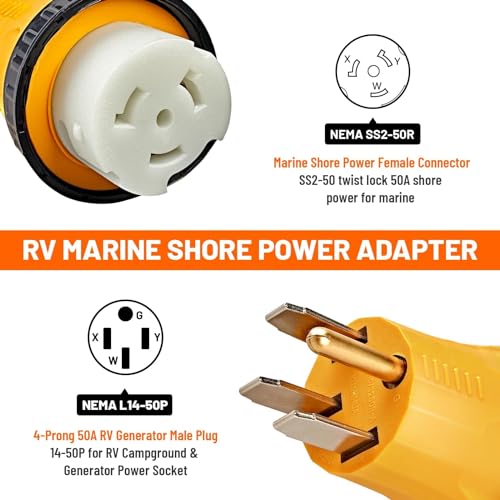 Molded Plug: - Heavy duty 50amp RV Shore power adapter designed to withstand elements like wind, rain, snow, soil, and rocks for long-lasting durability; Female receptacle locking (ss2-50r) feature to ensures safe and leak free power conduction; Perfect for you to connect the campground or generator power to your RV, Motorhome, Trailer or vehicle with built-in SS2-50P inlet