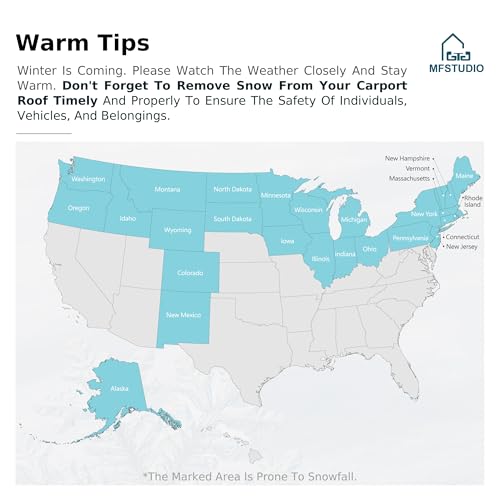 Stable and Safe Carport: This car carport canopy can be installed on dirt floors, asphalt or concrete and comes with all the necessary hardware and instructions to ensure its stability.The outdoor carport canopy roof is equipped with high-density weather stripping to keep it away from the small roof panels during rainy days and get superb protection against rainwater leaking onto the small roof panels