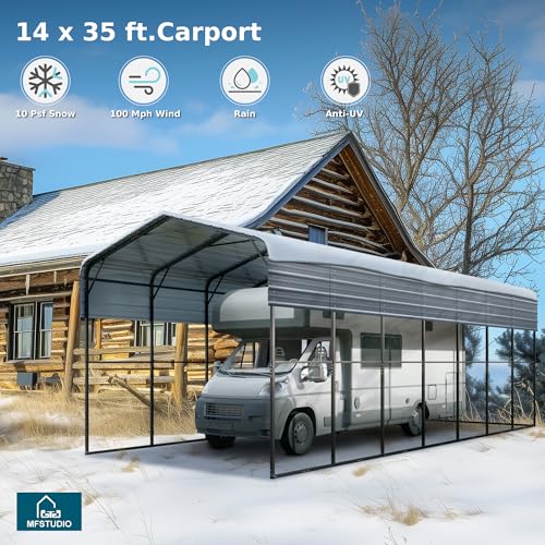 Outdoor Heavy Duty Carport: Our 14x35 carport features an upgraded corrugated galvanized steel roof and a robust iron frame made from powder-coated, anti-rust square pipes. It is rust-resistant, strong, and durable. With its solid structural design and high-quality materials, this carport is built to withstand any weather. Rest easy knowing that this outdoor carport garage shelter awning will provide excellent protection for your vehicle from the elements