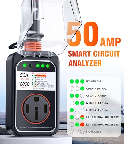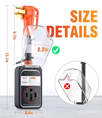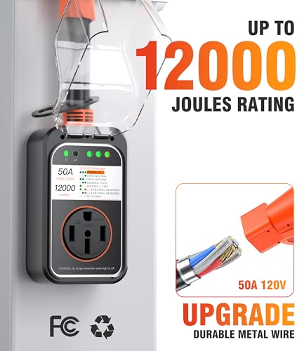 ???Upgraded 50 amp RV surge protector?It provides super 12000J surge protection and quickly identify faulty power resource, which is safe and reliable; And this protector can work safely and stably even in bad weather, it can be the best choice for most camping and RV trailers