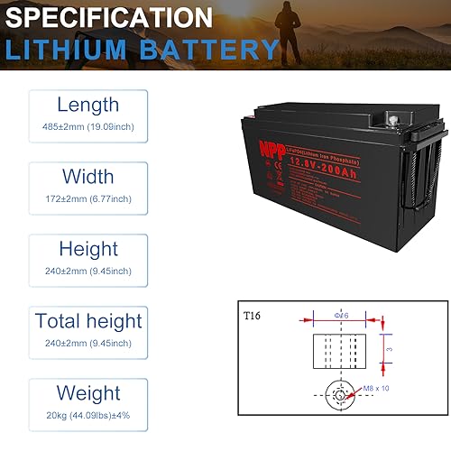 ?Half Lightweight And Twice Capacity?NPP 12V 200Ah LiFePO4 battery weighs only 44.09 lbs, only half weight and providing twice capacity in the same size as lead-acid batteries, you can easy to move and install. Length: 19.09-inch, Width: 6.77-inch, Height: 9.45-inch, Total Height: 9.45-inch.