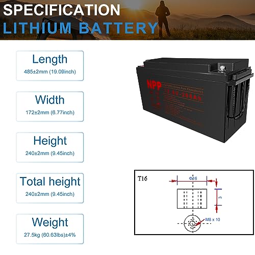?Half Lightweight And Twice Capacity?NPP 12V 200Ah LiFePO4 battery weighs only 44.09 lbs, only half weight and providing twice capacity in the same size as lead-acid batteries, you can easy to move and install. Length: 19.09-inch, Width: 6.77-inch, Height: 9.45-inch, Total Height: 9.45-inch.
