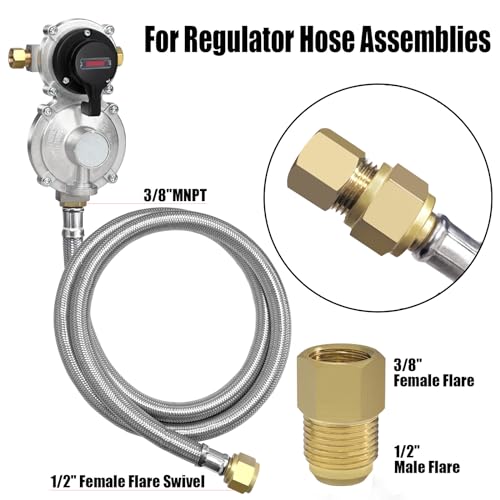 ?????2 Pack 18''Stainless Braided QCC1 1/4" Inverted Male Flare RV Pigtail Propane Hose with Gauge, and 1 Pack For Regulator Hose Assemblies?1/4" inverted male flare RV propane pigtail hose to 1/4" inverted male flare This propane tank hose come with tank gauge level indicator with 3 different colors Dial Gauge can glows in dark allows you to read and monitor the gas level without necessarily removing the tank and can detect the leak. 48in 3/8" ID Hose Assembly (3/8" MNPT x 1/2" Female Flare)
