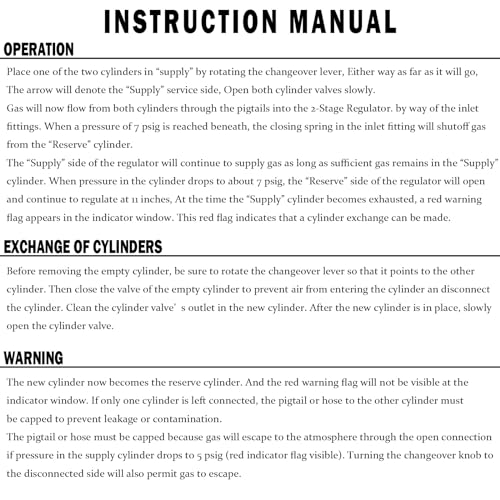 ?????2-Stage Auto Changeover LP Propane Gas Regulator?This 2-Stage regulator can be connected to 2 propane tanks at the same time and automatically switches from primary to reserve tank when primary is empty and The indicator will changes color to let you know when a tank has been depleted and needs to be refilled also remind you switching to the backup tank. For RVs with dual propane tanks allow removal of Allows removal of empty cylinder for refill without interrupting propane supply.