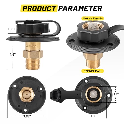 Built-in Check Valve: Features a built-in check valve to prevent backflow, ensuring the quality and safety of your water supply; A rubber dust cap is fitted onto the RV water inlet valve to keep dust and other contaminants from entering the water supply, ensuring a clean water supply