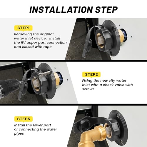 Easy to Install: Simply unscrew the leaking or damaged valve on your RV, then screw into a new RV water inlet flange with the provided screws. Note: the RV city water inlet should be screwed into at the correct angle to prevent leaking