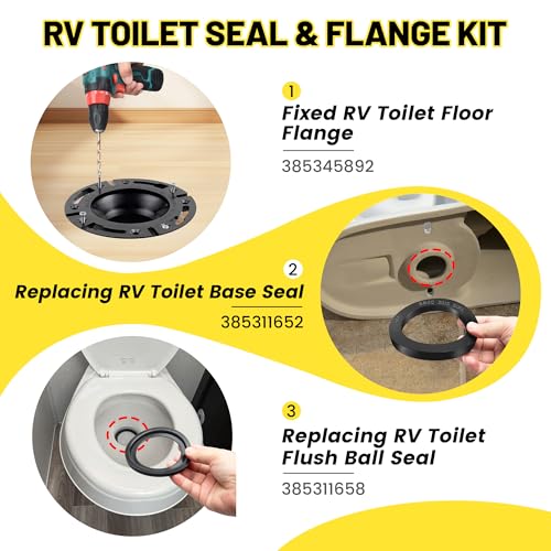 ?Compatibility?: This RV Toilet Flange and Seal Kit replaces 385345892 RV toilet floor flange seal, 385311652 RV Toilet Gasket and 385311658 Flush Ball Seal, compatible with Dometic 300 310 320 RV Toilets, ideal for solving RV toilets sealing problems