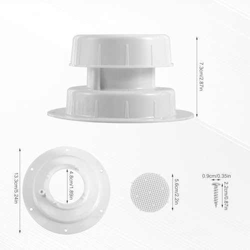 Product Size: The diameter of RV roof vent cap is 13.3cm/5.24in, height: 7.3cm/2.87in, middle hole diameter: 4.8cm/1.89in. Fits 1 to 2 3/8" in diameter pipes, ensuring a perfect fit for your RV roof.