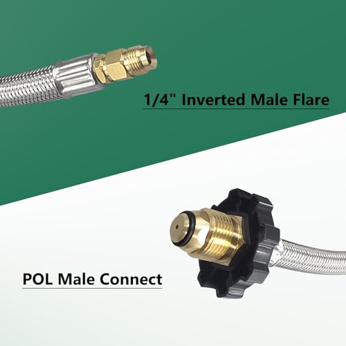 The POL x 1/4" Inverted Male Flare RV Propane Hose and regulators feature an easy-to-install design, and the propane tank adapter features a handwheel that makes it easy to tighten without tools.Our 5ft hose and adapter is CSA certified to ensure air tightness and stability.