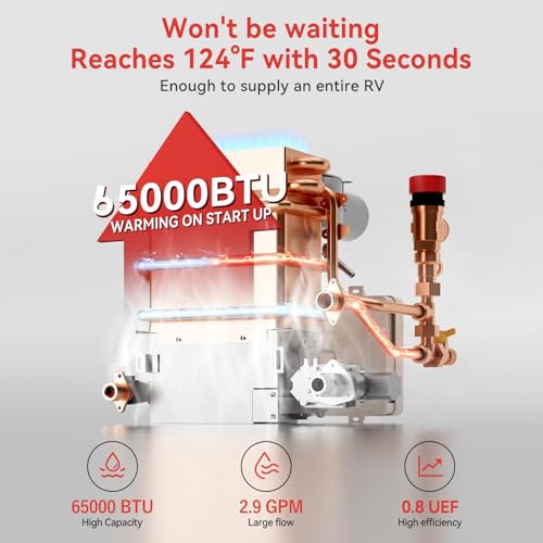 High Performance Technology - With 65,000 BTU output, oxygen-free copper heat exchanger, and a brushless DC fan, this tankless rv water heater is designed for high-altitude use, providing more stable hot water in winter, preventing overheating during the summer and ensuring maximum energy efficiency, perfect for winter, heats up quickly and maintains a stable temperature