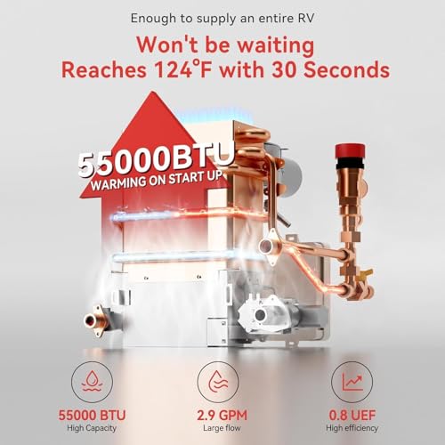 High-Performance Technology — With a 55,000 BTU output power, an oxygen-free copper heat exchanger, and a brushless DC fan, this tankless water heater for RV is engineered for high-altitude use and employs segmented combustion to prevent overheating during the summer months, ensuring high energy efficiency and maximum comfort.