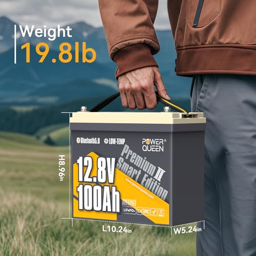 ?Smaller & More Space-Efficient Design – 22% Shorter, 24% Narrower?The Power Queen 12V 100Ah Mini LiFePO4 Battery is designed with compactness in mind, measuring 22% shorter and 24% narrower than traditional 12V 100Ah LiFePO4 batteries. With dimensions of L10.24in x W5.24in x H8.96in, it saves valuable space, making it an excellent fit for RVs, boats, and compact energy storage setups