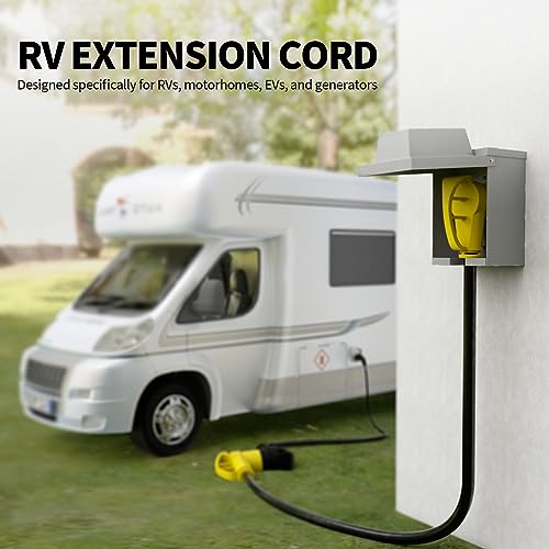 30AMP RV Extension Cord: 3 Prong RV cord 25 FT; 30Amax, 125V, NEMA TT-30P Male to NEMA TT-30R Female, STW 10/3 AWG; Outdoor RV cord 30 amp is ideal for motorhomes, travel trailers, auto vehicles, and outside campers