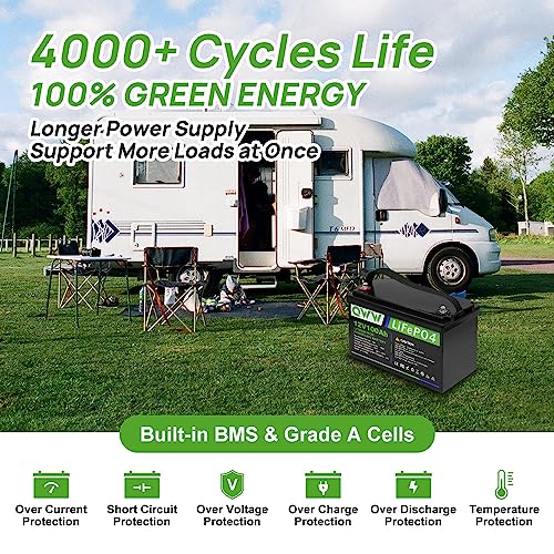 12V 100Ah Lithium battery builds in 100A BMS, which can prevent the LifePO4 battery from the most common issue causing of battery failure, such as overcharge, over-discharge, over-current and short circuit. The maximum charging current is 20A and can be fully charged within 5 hours (using a 14.6V 20A charger).
