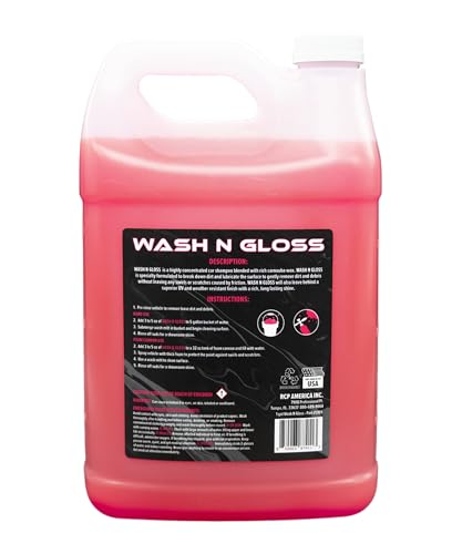 Wash 'N' Gloss is a highly concentrated car shampoo blended with rich carnauba wax. Wash 'N' Gloss is specialty formulated to break down dirt and lubricate the surface to gently remove dirt and debris without leaving any swirls or scratches caused by friction. Infused with high quality, all-natural carnauba wax, Wash 'N' Gloss will also leave behind a superior UV and weather resistant finish with a rich, long lasting shine. pH Balanced Car Shampoo with Wax Protection pH Balanced Formula Maintains Recently Waxed Vehicles without Stripping Wax or Sealant Coatings Protects Paint & Adds High Gloss Shine Perfect for Weekly Washes with Added Wax Protection