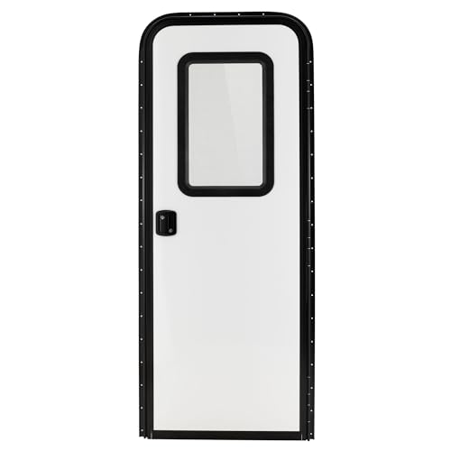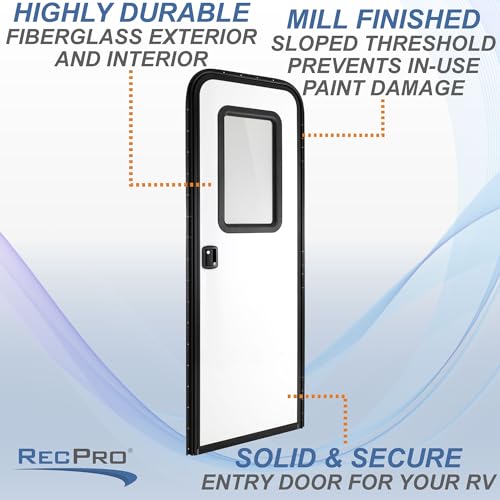 Durable and secure - Our RV entry door features a fiberglass exterior and interior with rounded corners and a mill finish sloped threshold. A black door lock with 2 keys keeps the door tightly secured. The rubber seals in the door and window prevent moisture leakage, so you can enjoy peace of mind.