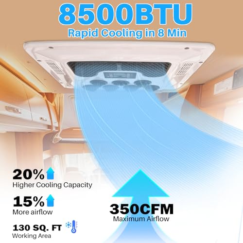?????Roof Top Air Conditioner for Camper Life Comfort?When you're battling the summer heat in your RV, a 12-volt DC air conditioner will cool you down fast. 8,500 BTU's of high cooling capacity and 350 CFM's of powerful airflow can cover a larger space up to 130 square feet. Runs on electric power and saves up to $6,000 per year in fuel costs.